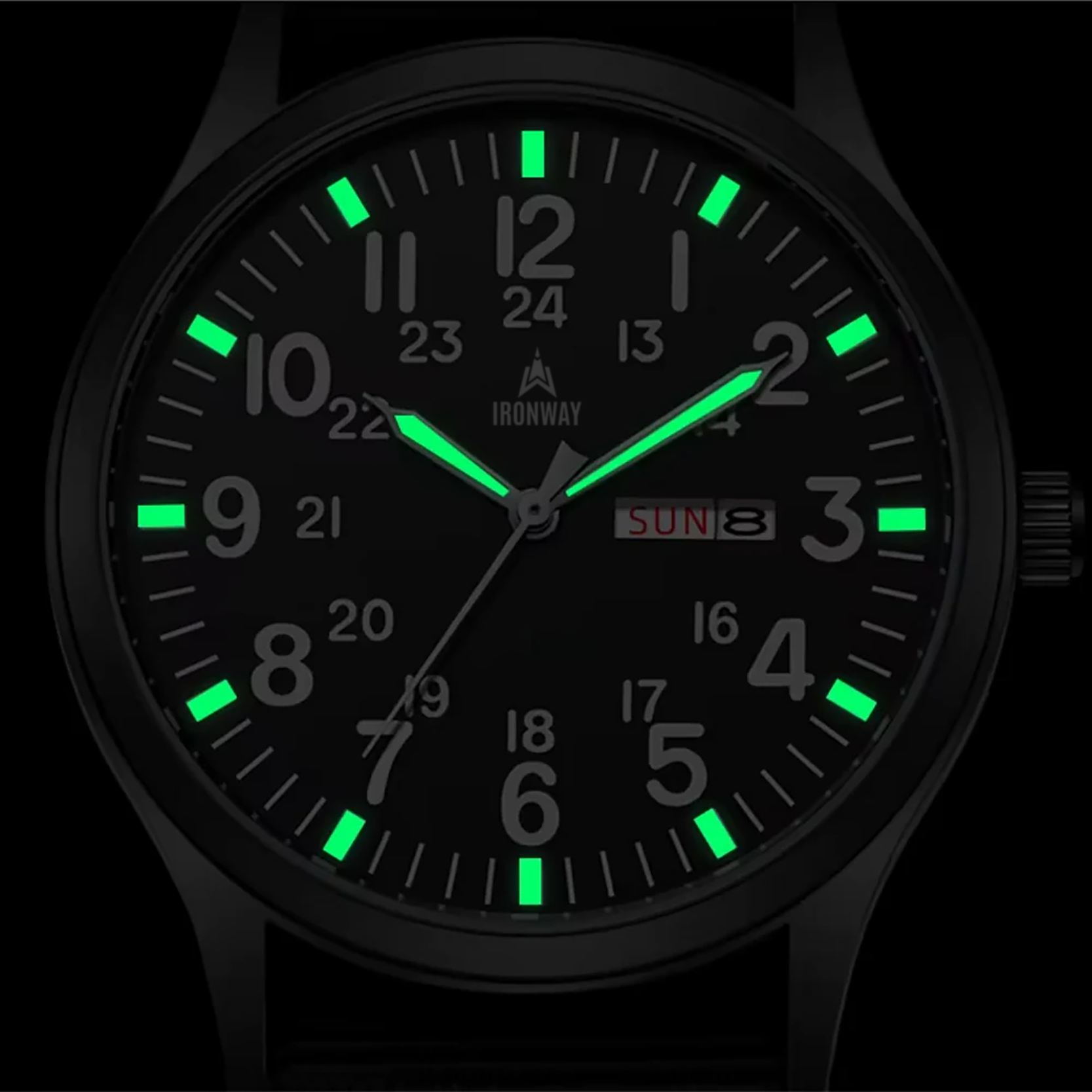 Remember trying to check time during pre-dawn alpine starts? Ironway's long-lasting luminous coating on hands and markers charges quickly and glows bright all night - far superior to dim competitors.